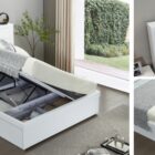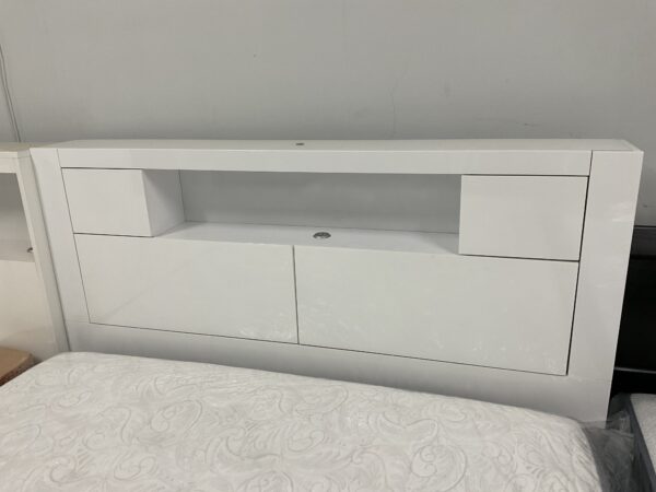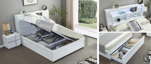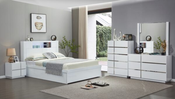4PC bedroom suite includes 1 queen bedframe + side gas lift & foot draw, light & usb port + 2 bedside + 1 dresser