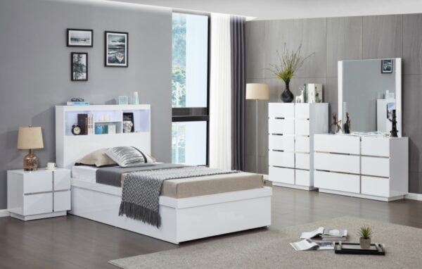 3PC bedroom suite includes 1 king single bedframe + side gas lift, foot draw, light & usb port + 1 bedside + 1 tallboy